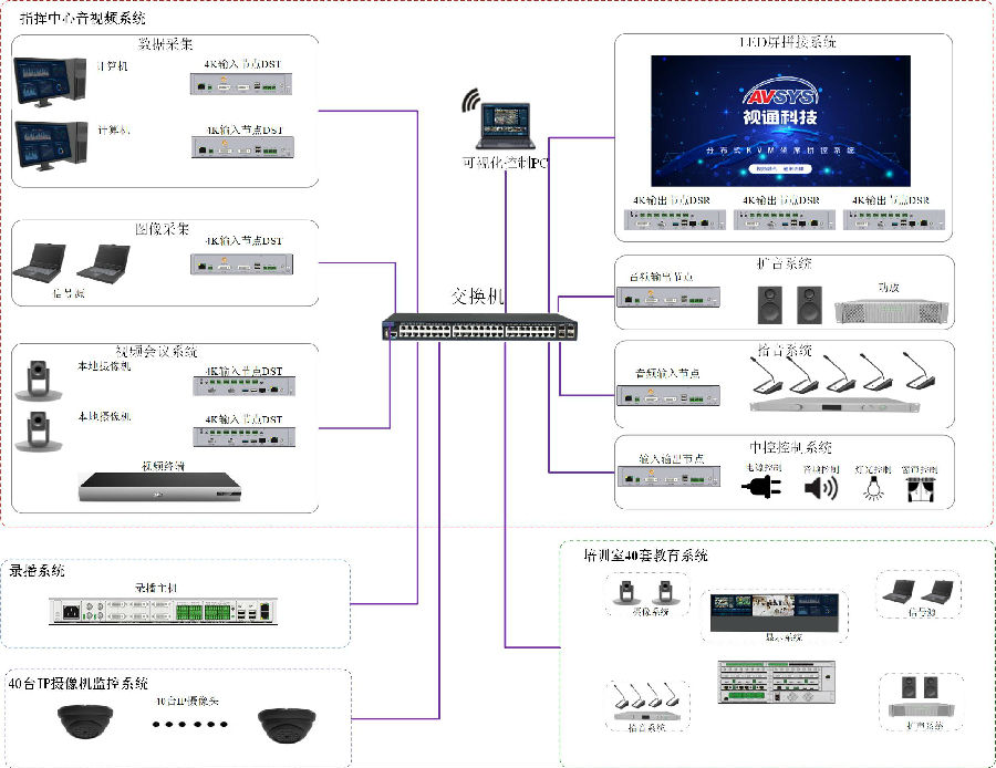 本次为满足河北某部队指挥中心应用,2121非凡科技采用自主研发生产的4K分布式ADS、AVSRTM六合一的高清录播一体机和可视化管控平台,实现指挥中心系统的统一管控、音视频图像调度、会议通讯互动交流和录播等应用。