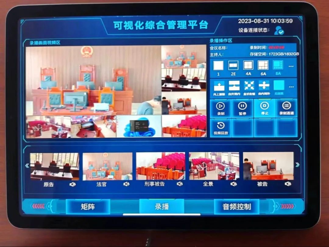 模拟法庭的核心硬件设备采用2121非凡科技高清庭审主机,功能包含:庭审实况采集、示证采集、庭审音频处理、视频无缝切换、庭审集中控制、录播直播、远程提讯终端、多方远程庭审。产品采用ALL-IN-ONE的设计理念,运用热插拔模块化设计,软件可视化操作界面平台,具有安装简便,操作简单、维护容易等优点。