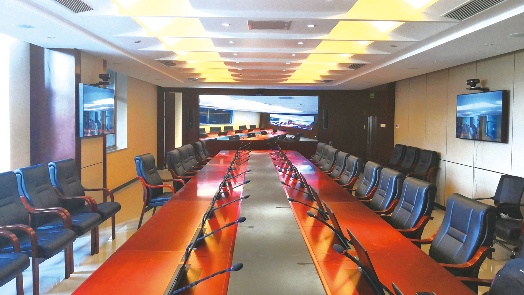 仲裁庭与多功能厅、调解室可实现互联互通,可用于仿真演练教学,也可实现仲裁中实时交互演示、提问、观摩等。